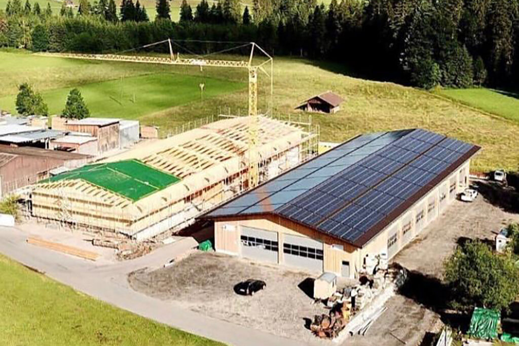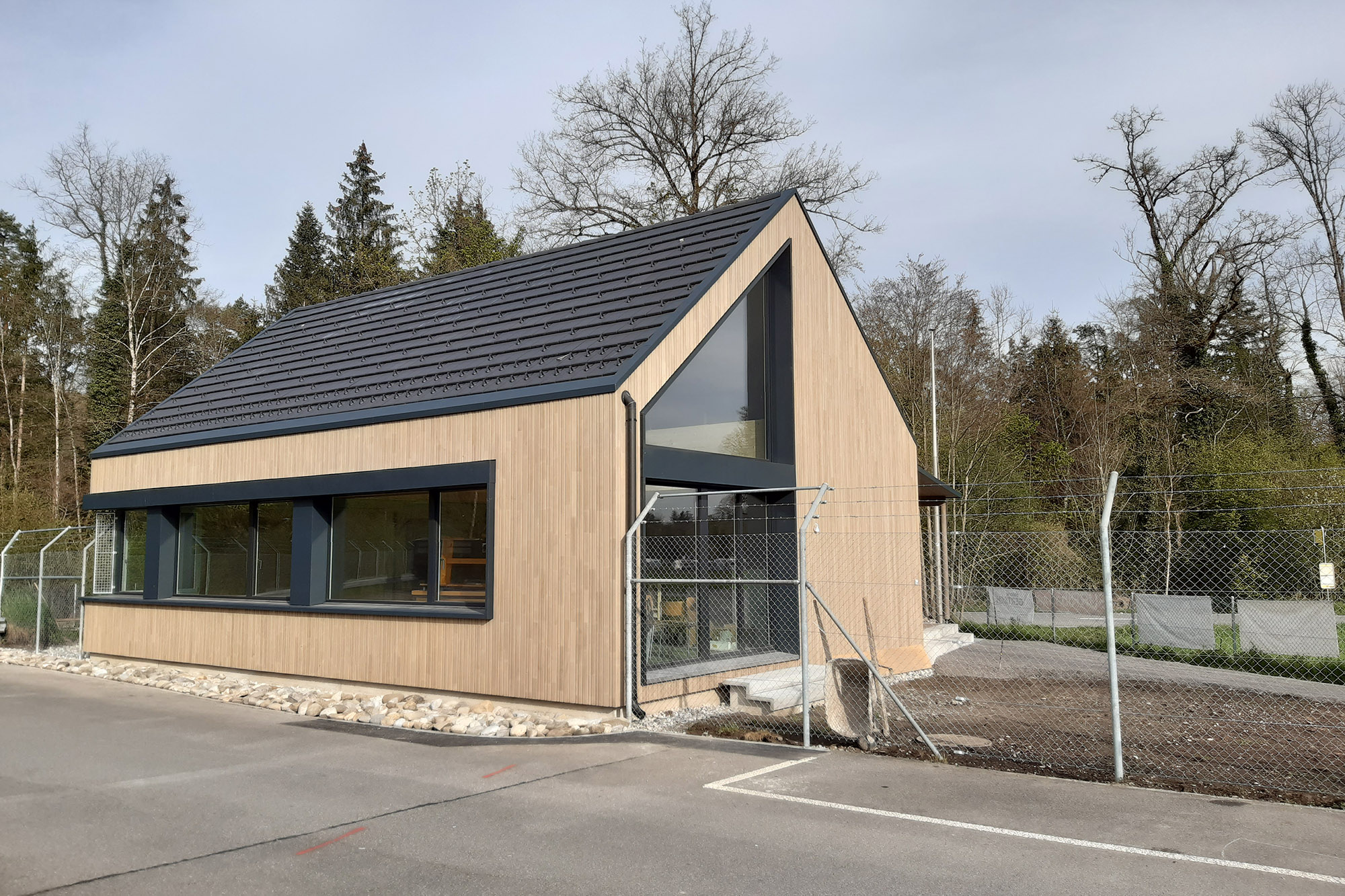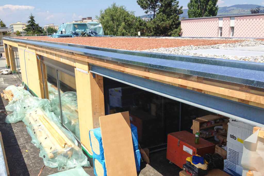 Arbeiten: Elementbau, Dachkonstruktion, Dachaufbau, Fassade, Innenausbau und Bodenbeläge