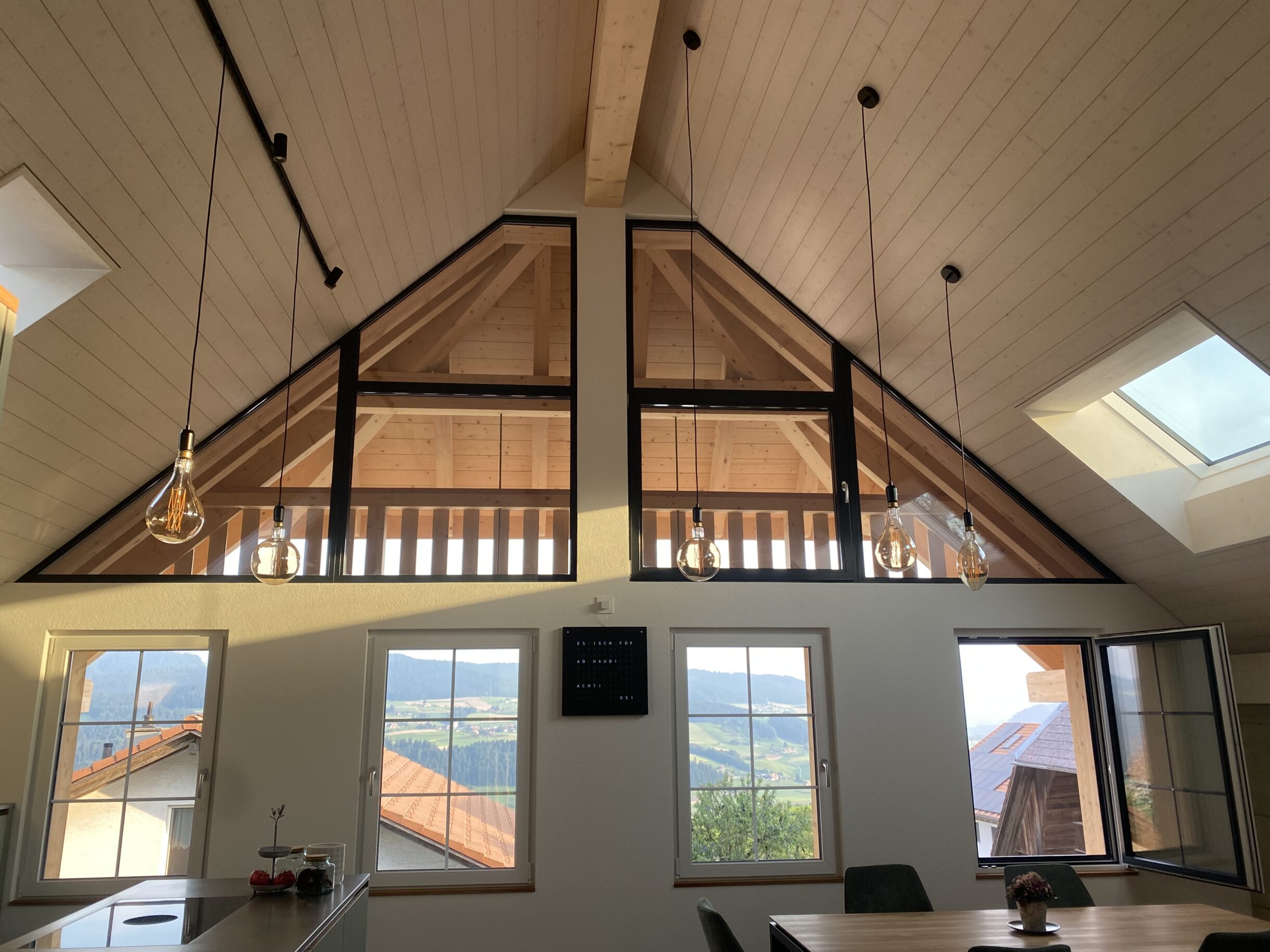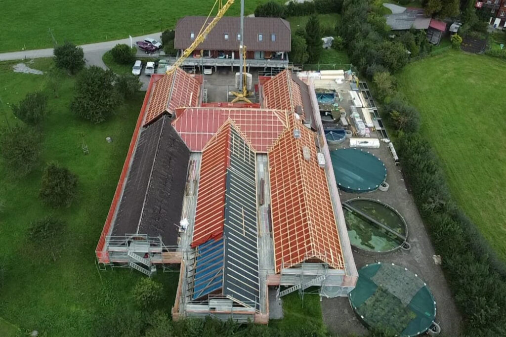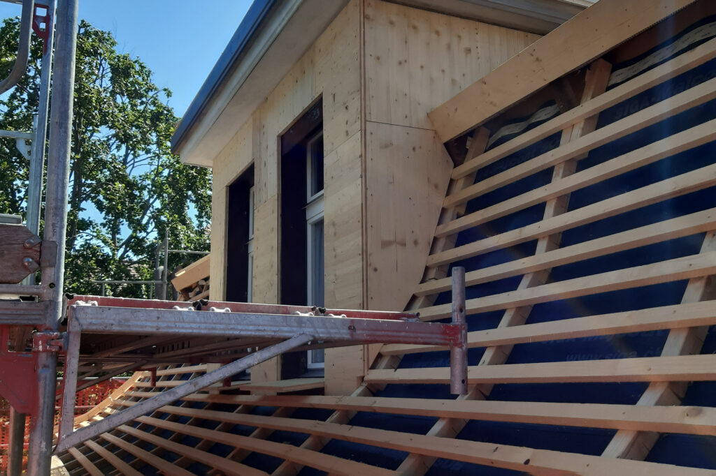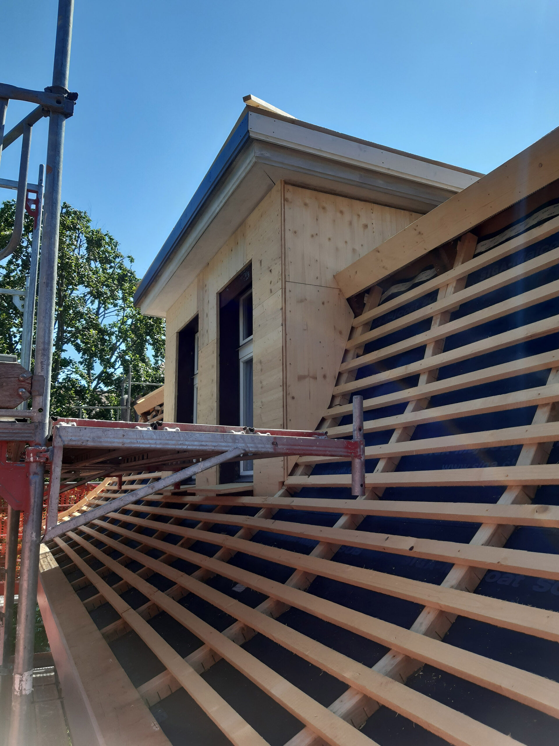 Arbeiten: Dachkonstruktion, Wärmedämmung, Unterdach, Dachgesims, Fassadenverkleidungen und Innenausbau.